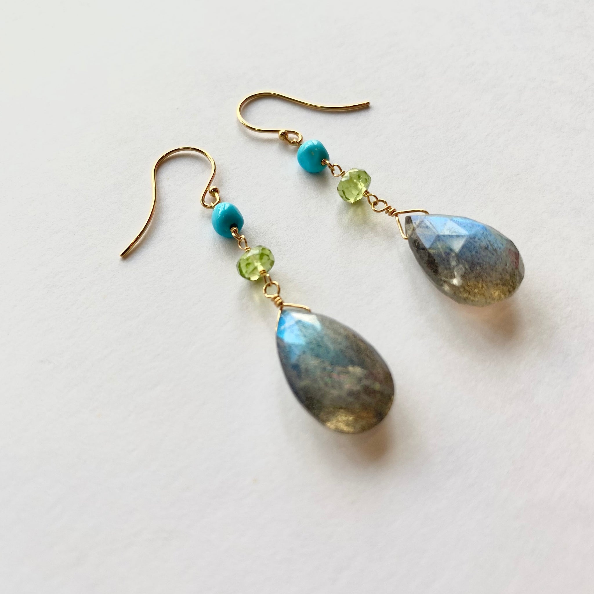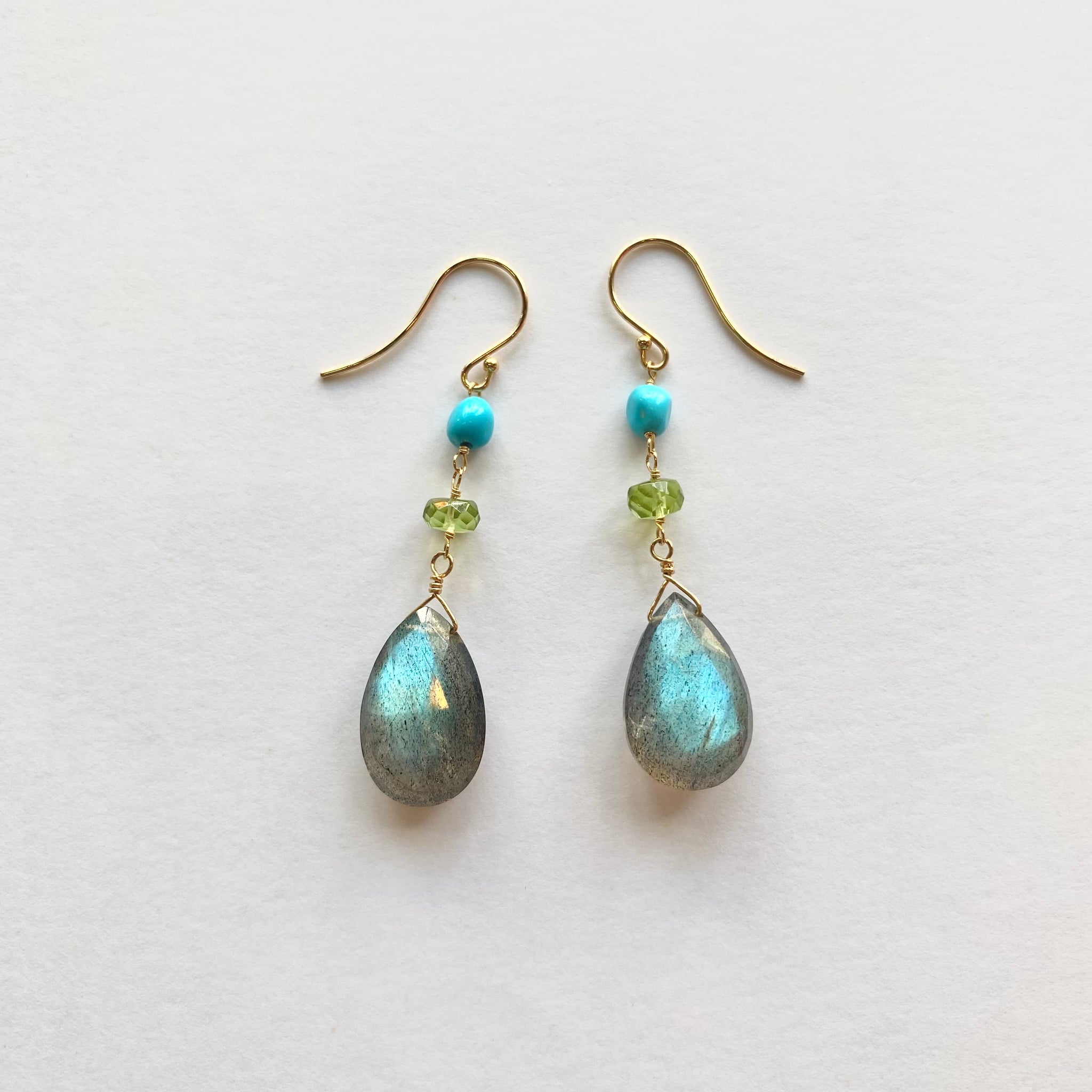 上からターコイズ、ペリドット、ドロップカットのラブラドライトの組み合わせのピアス。