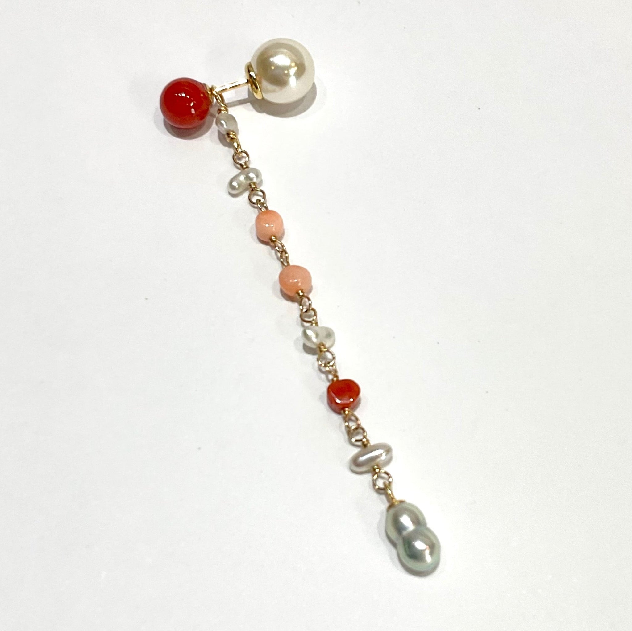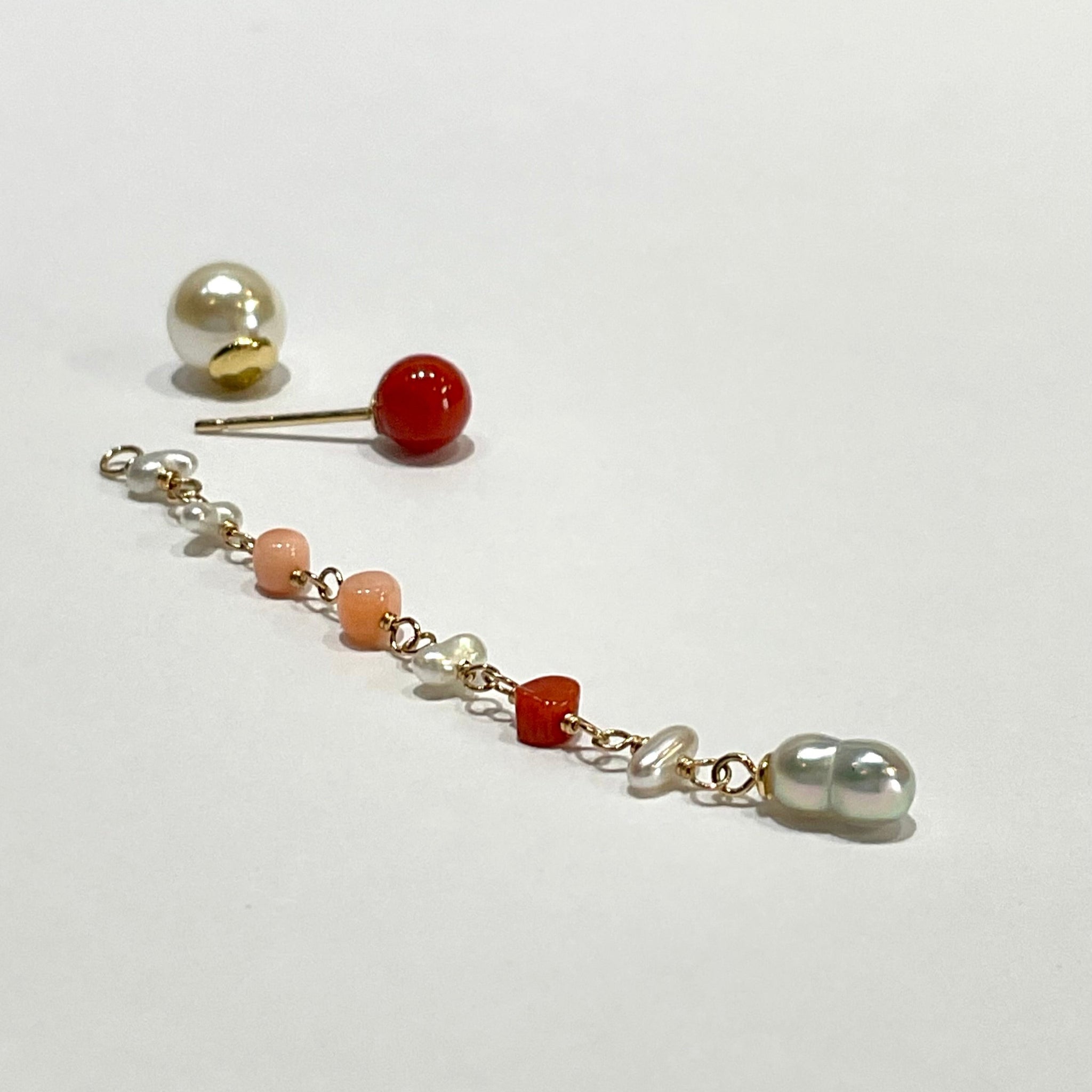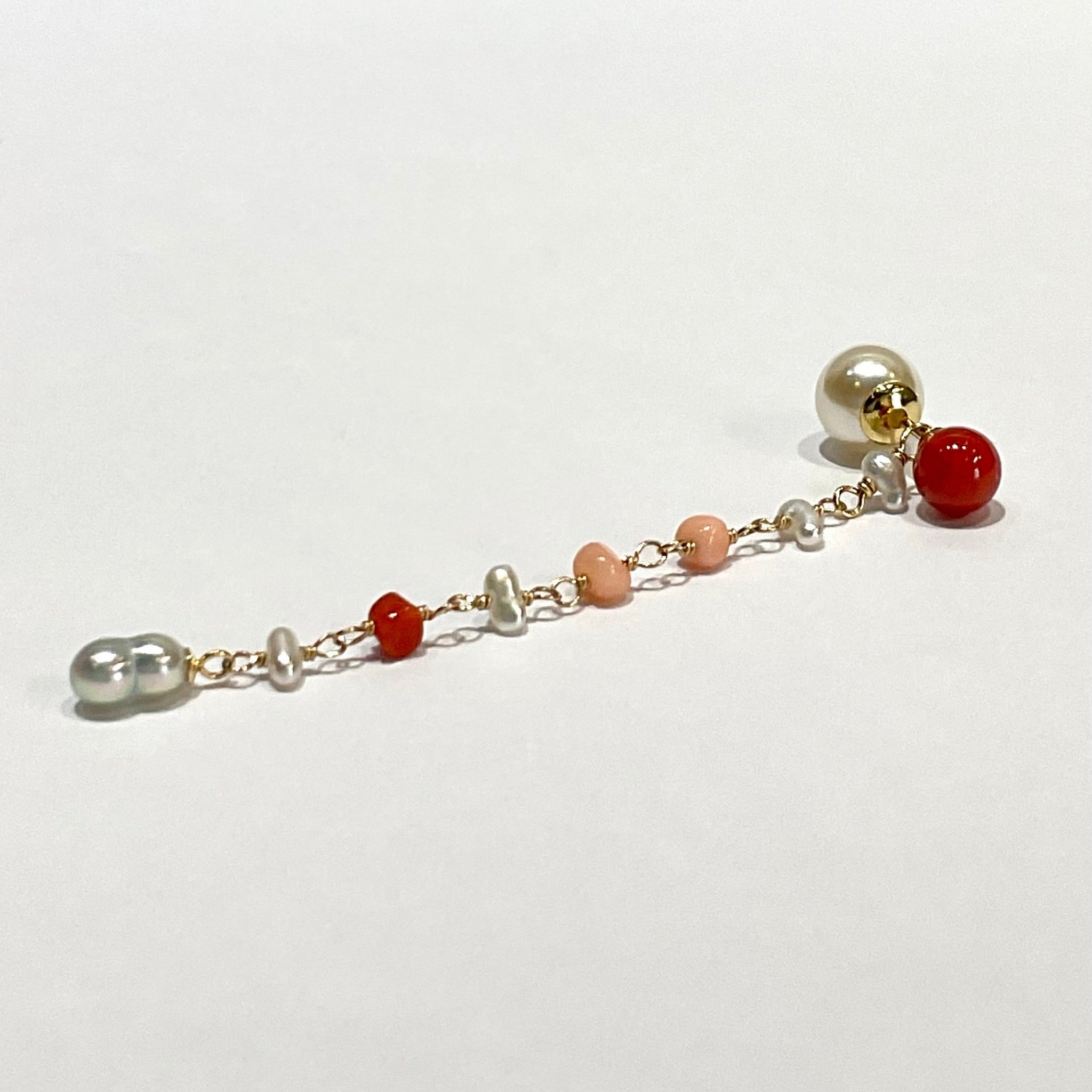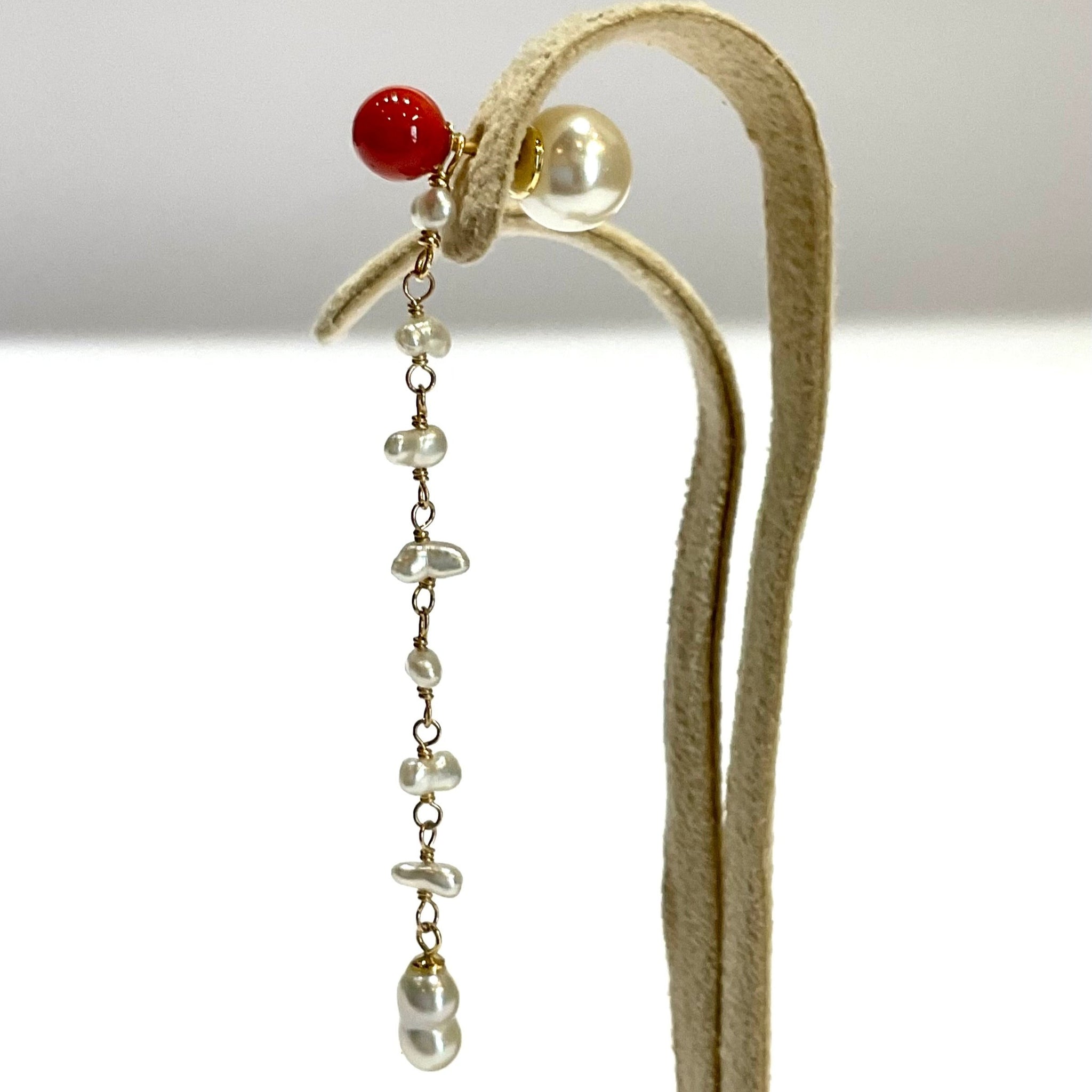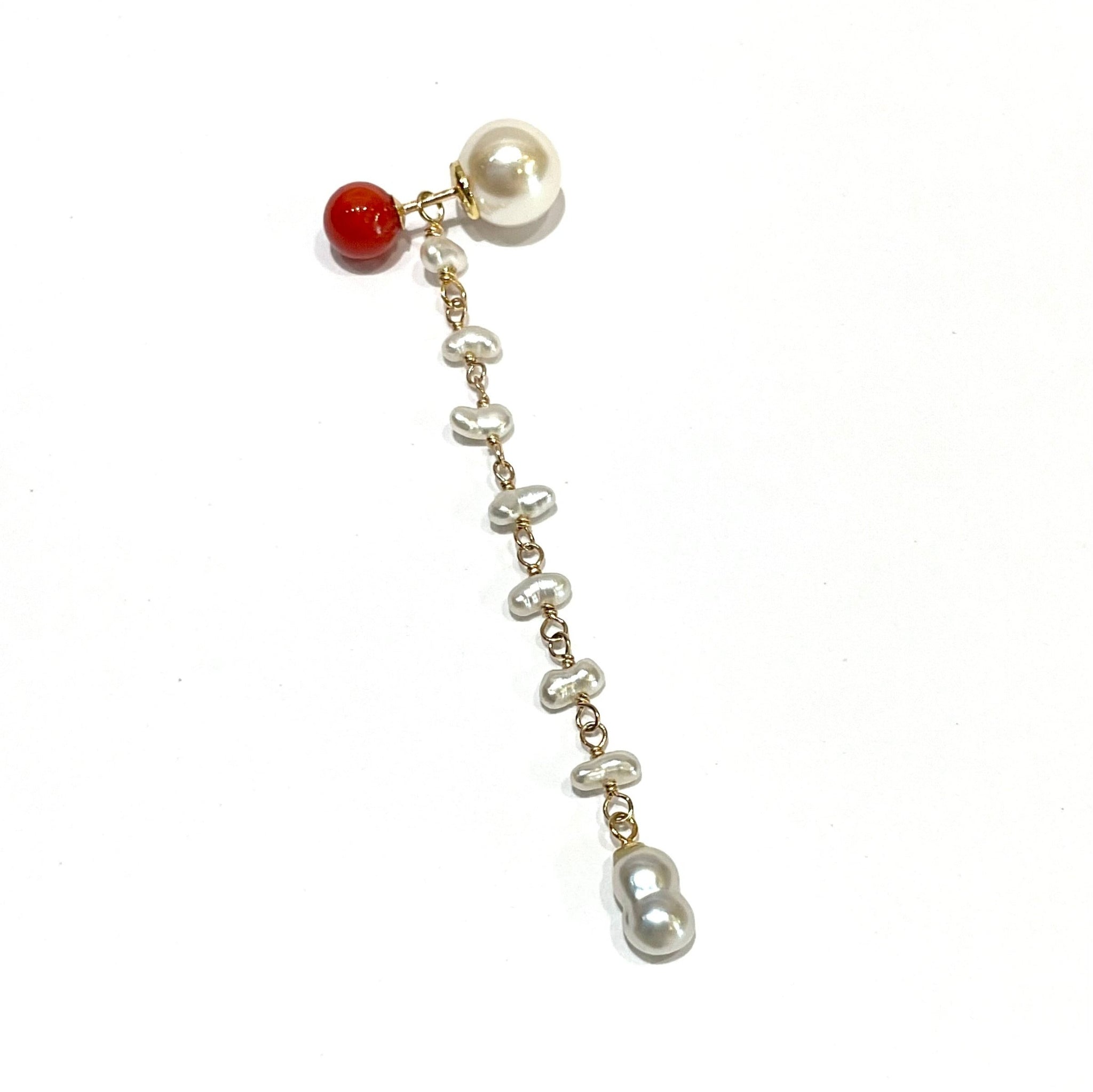 鮮やかな赤が魅力的な丸玉のサルジ珊瑚に、小粒のサルジ珊瑚や深海珊瑚、あこやベビーパールを組み合わせたチャームがかわいいピアス。
