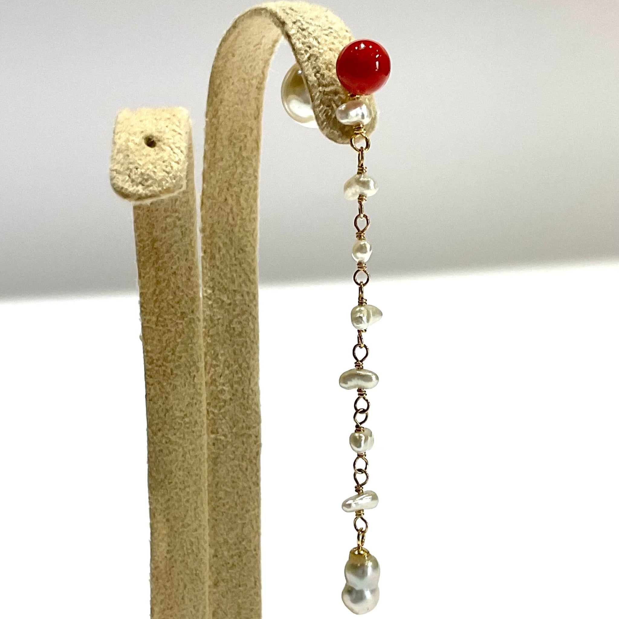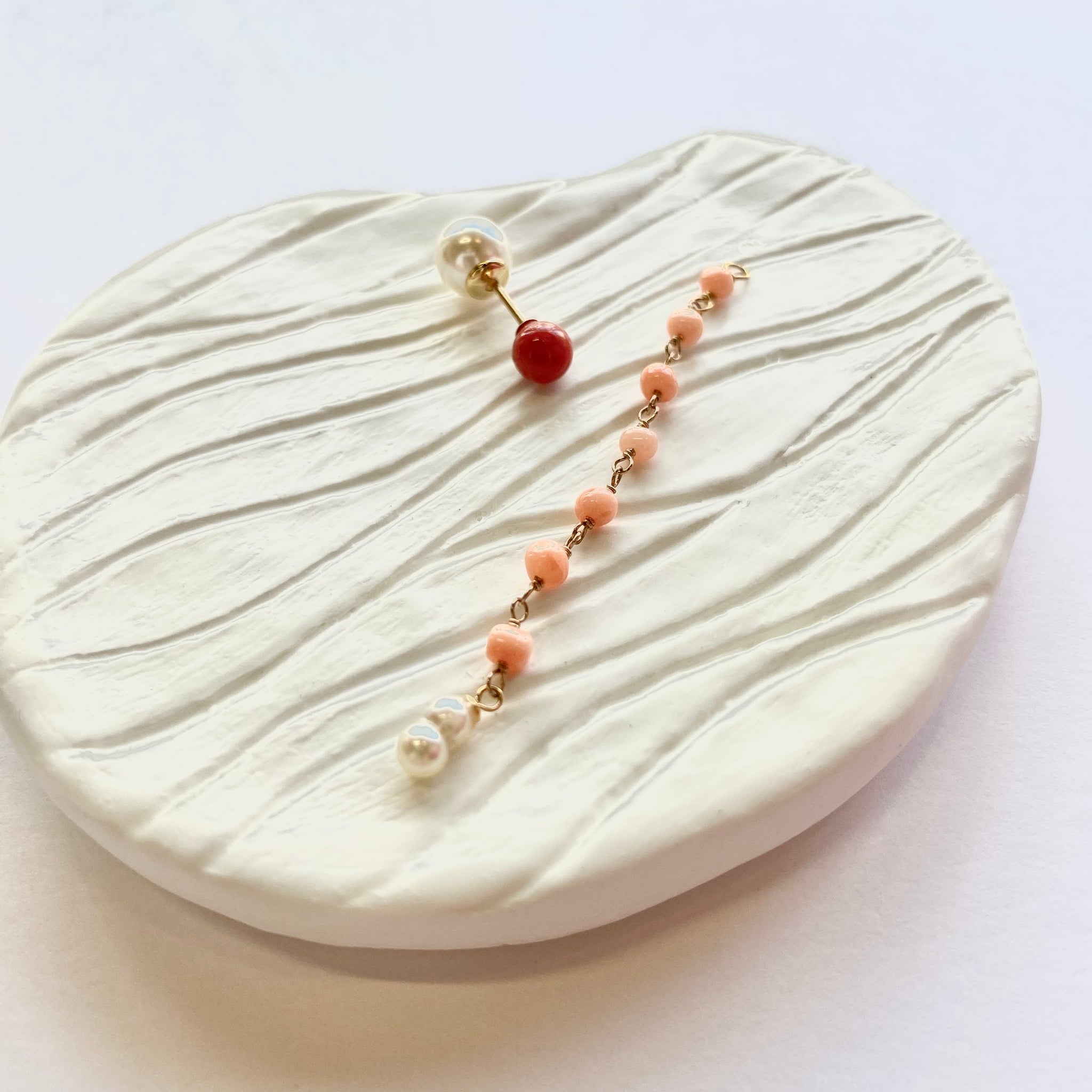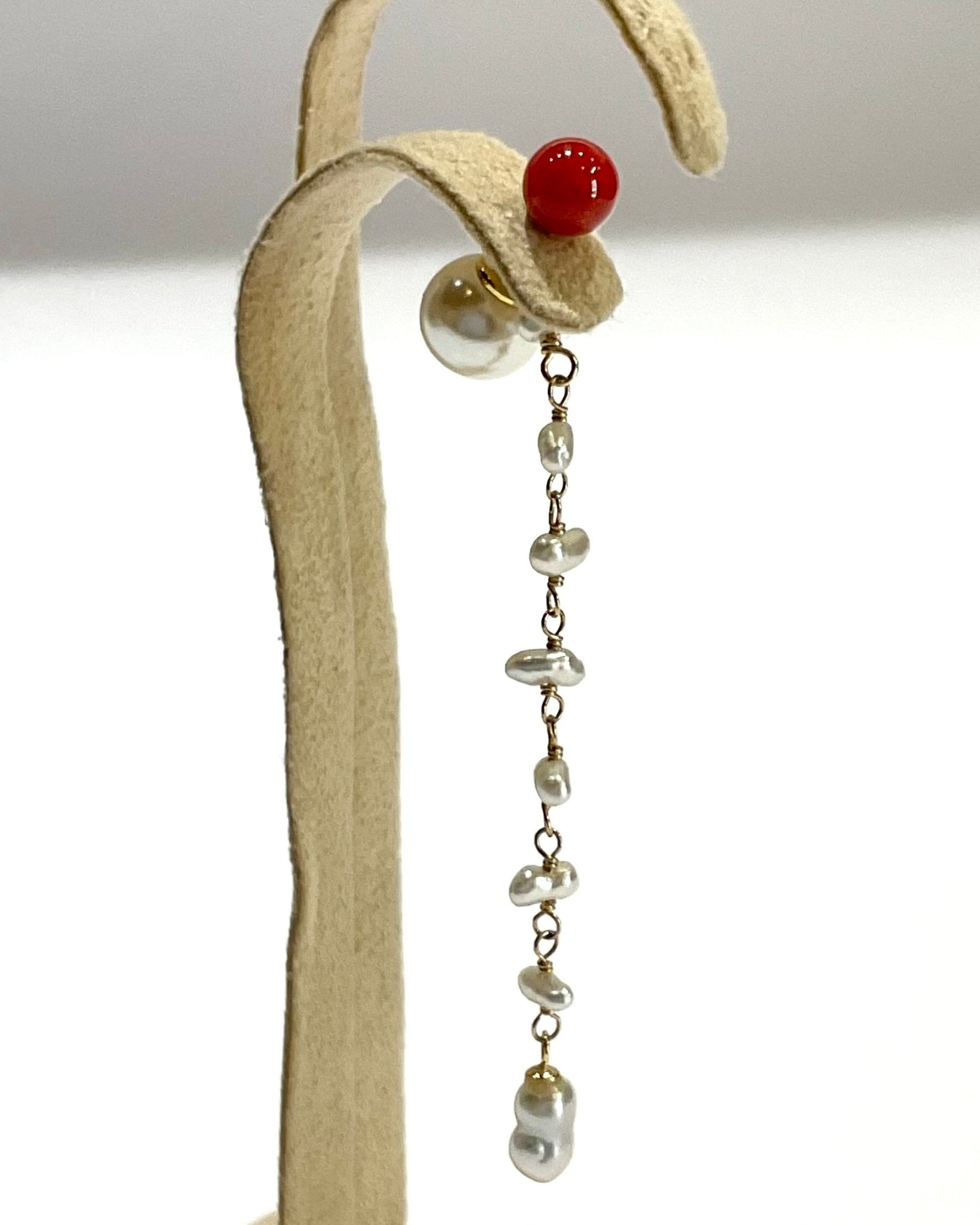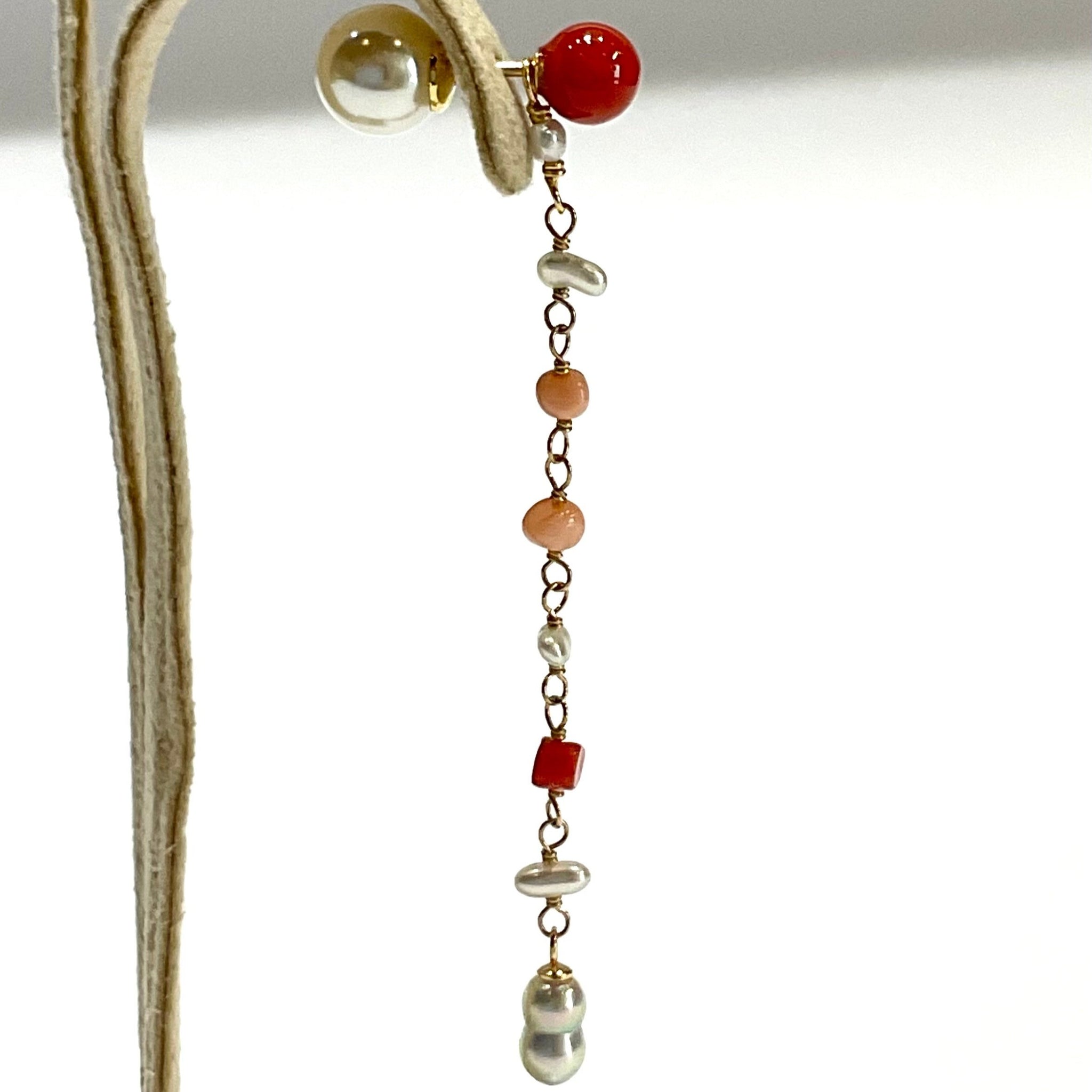 鮮やかな赤が魅力的な丸玉のサルジ珊瑚に、小粒のサルジ珊瑚や深海珊瑚、あこやベビーパールを組み合わせたチャームがかわいいピアス。