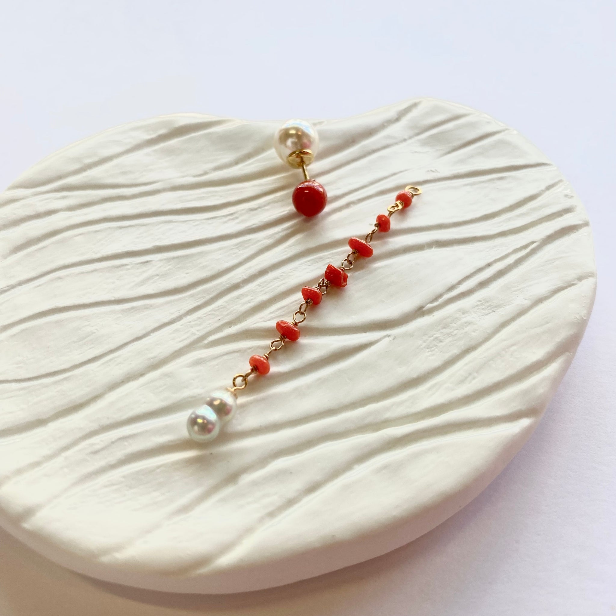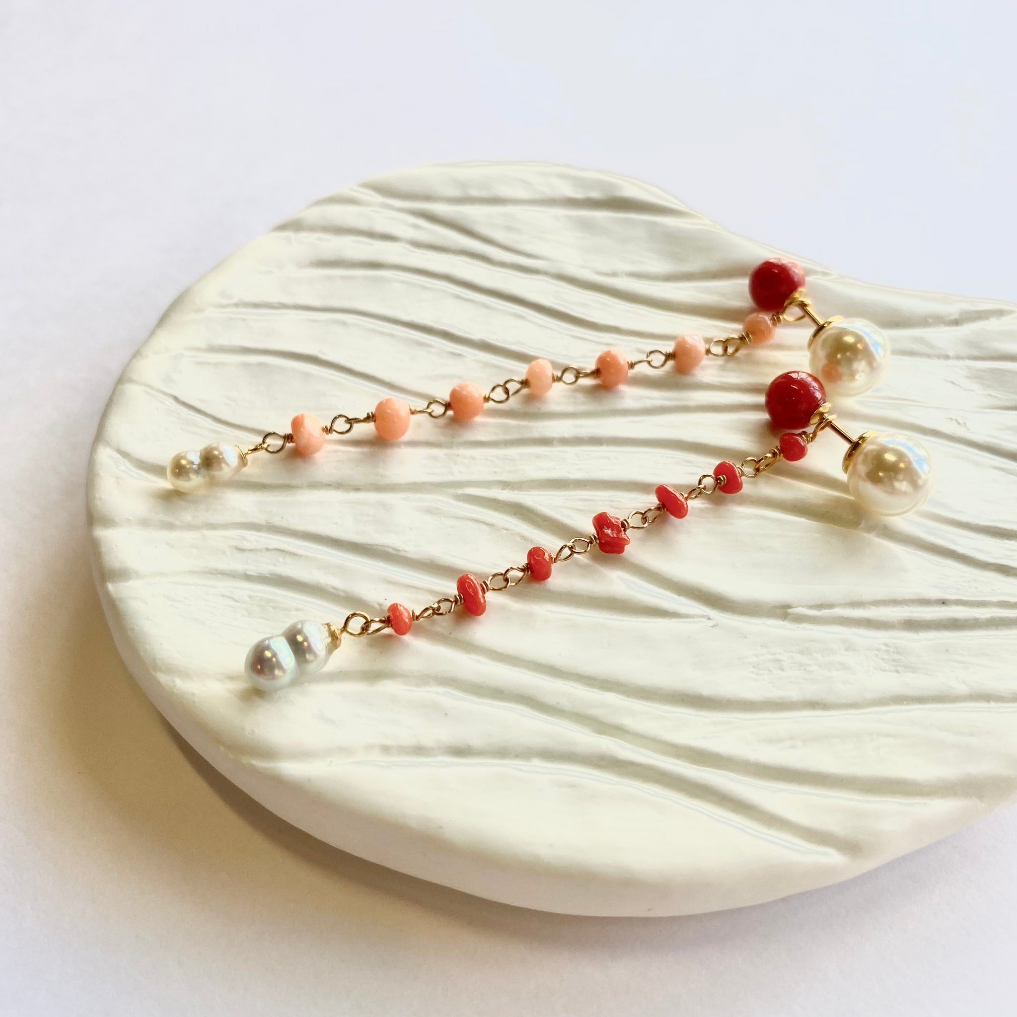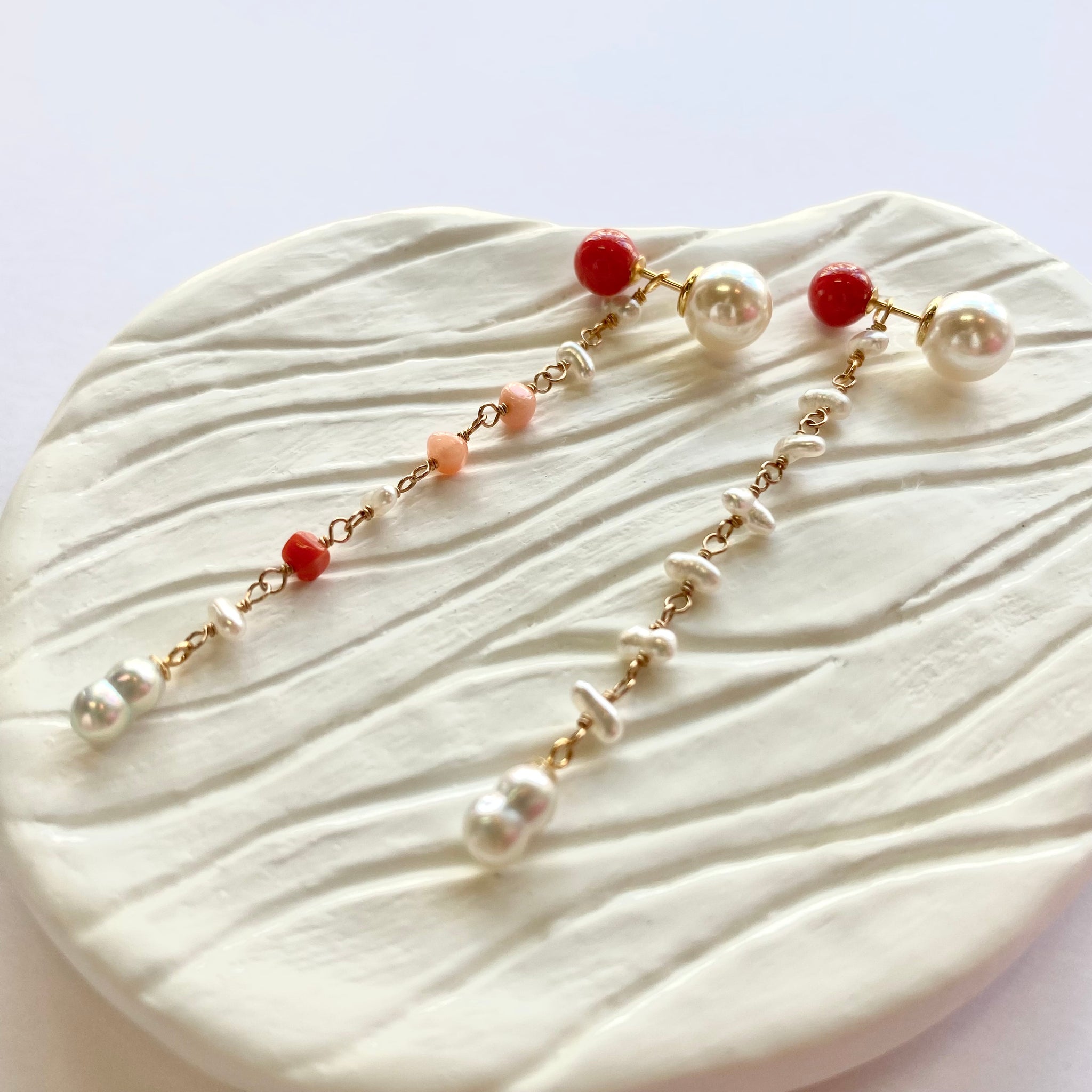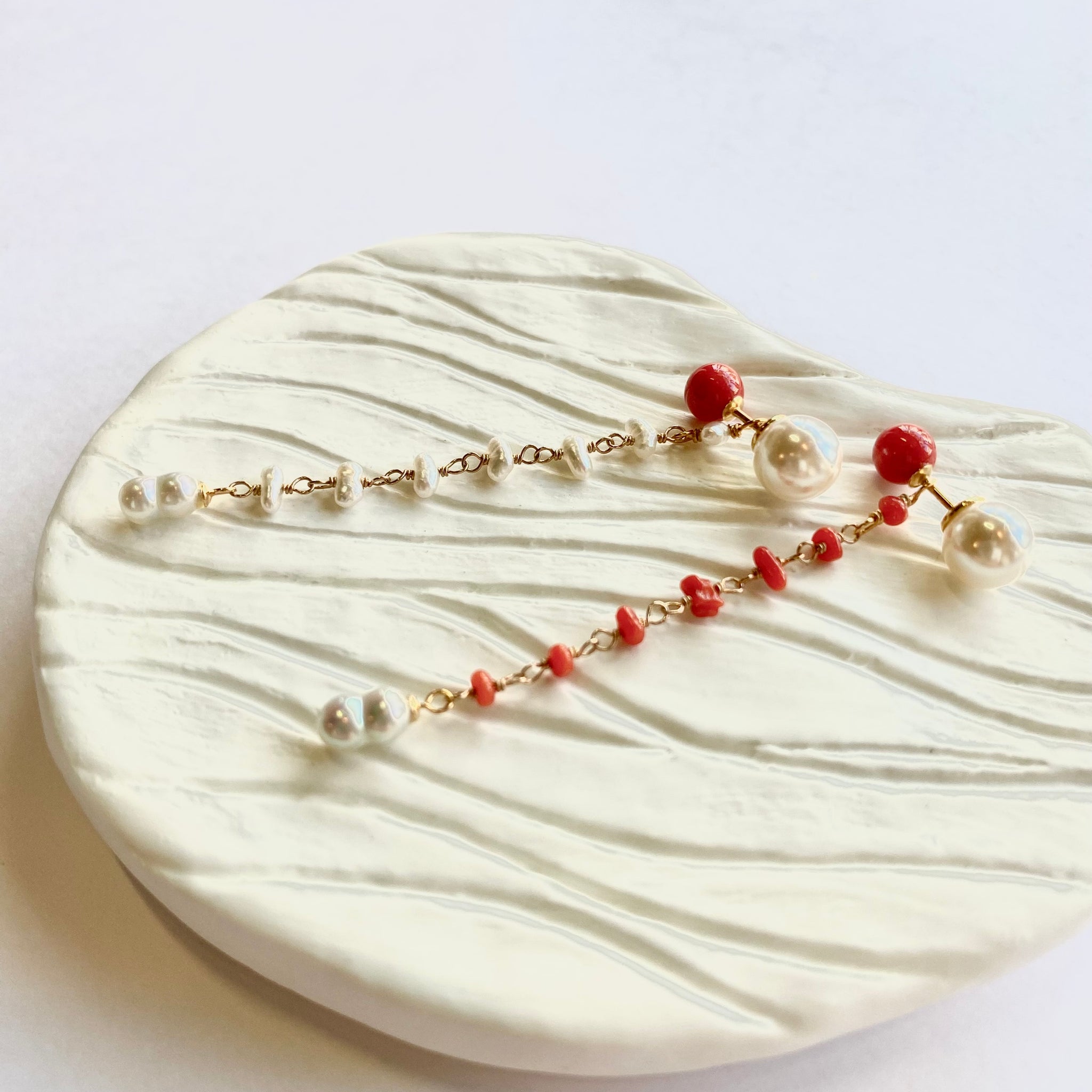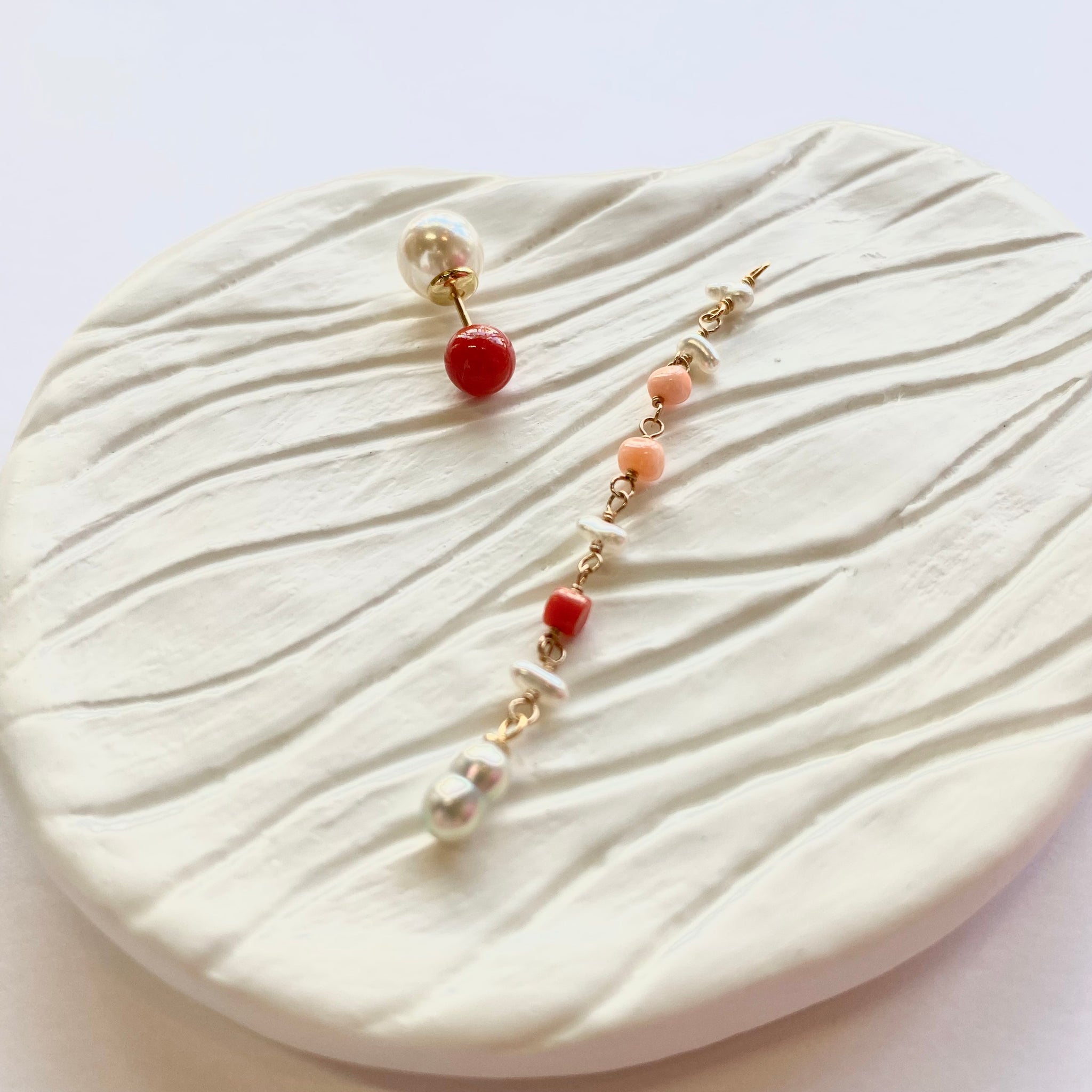 鮮やかな赤が魅力的な丸玉のサルジ珊瑚に、小粒のサルジ珊瑚や深海珊瑚、あこやベビーパールを組み合わせたチャームがかわいいピアス。