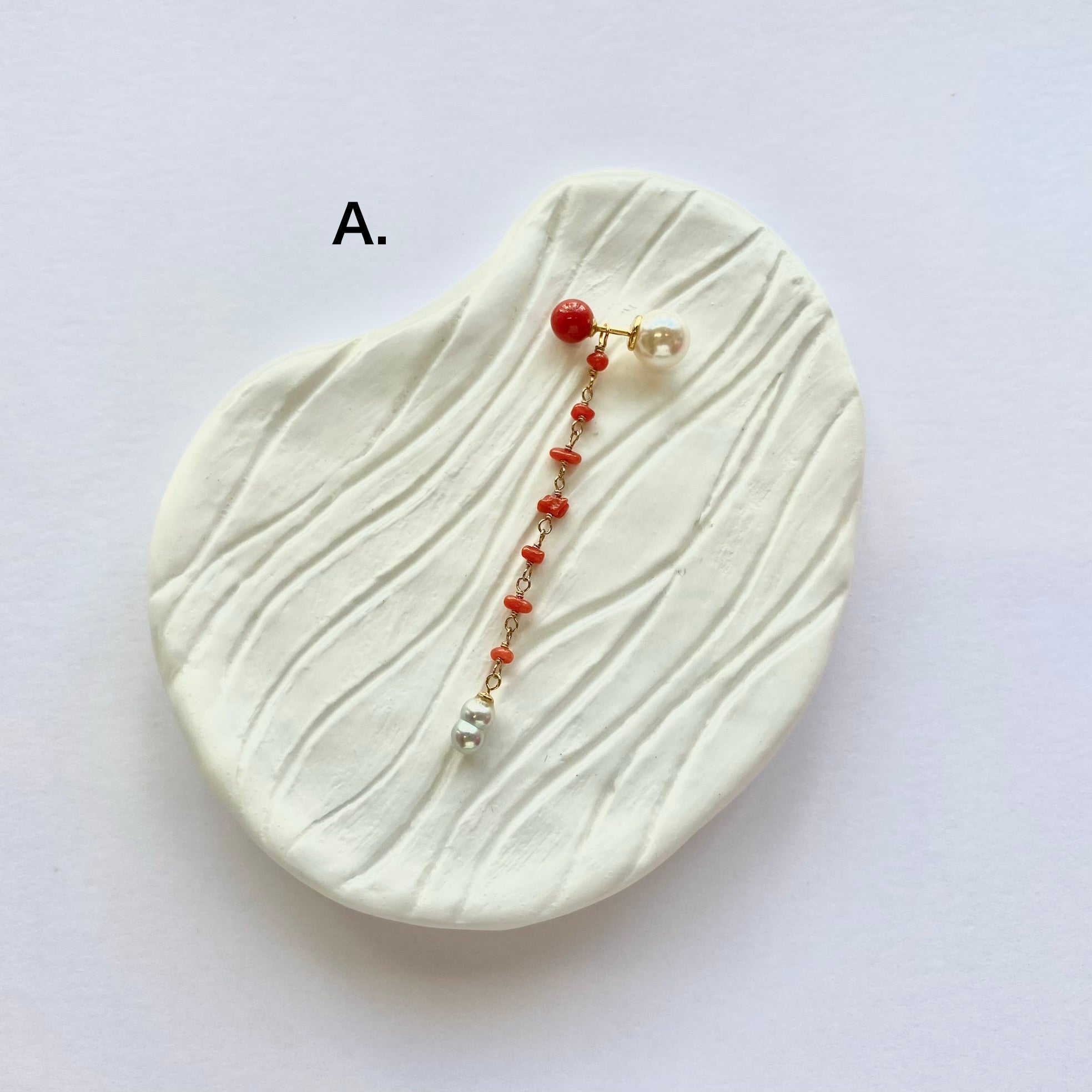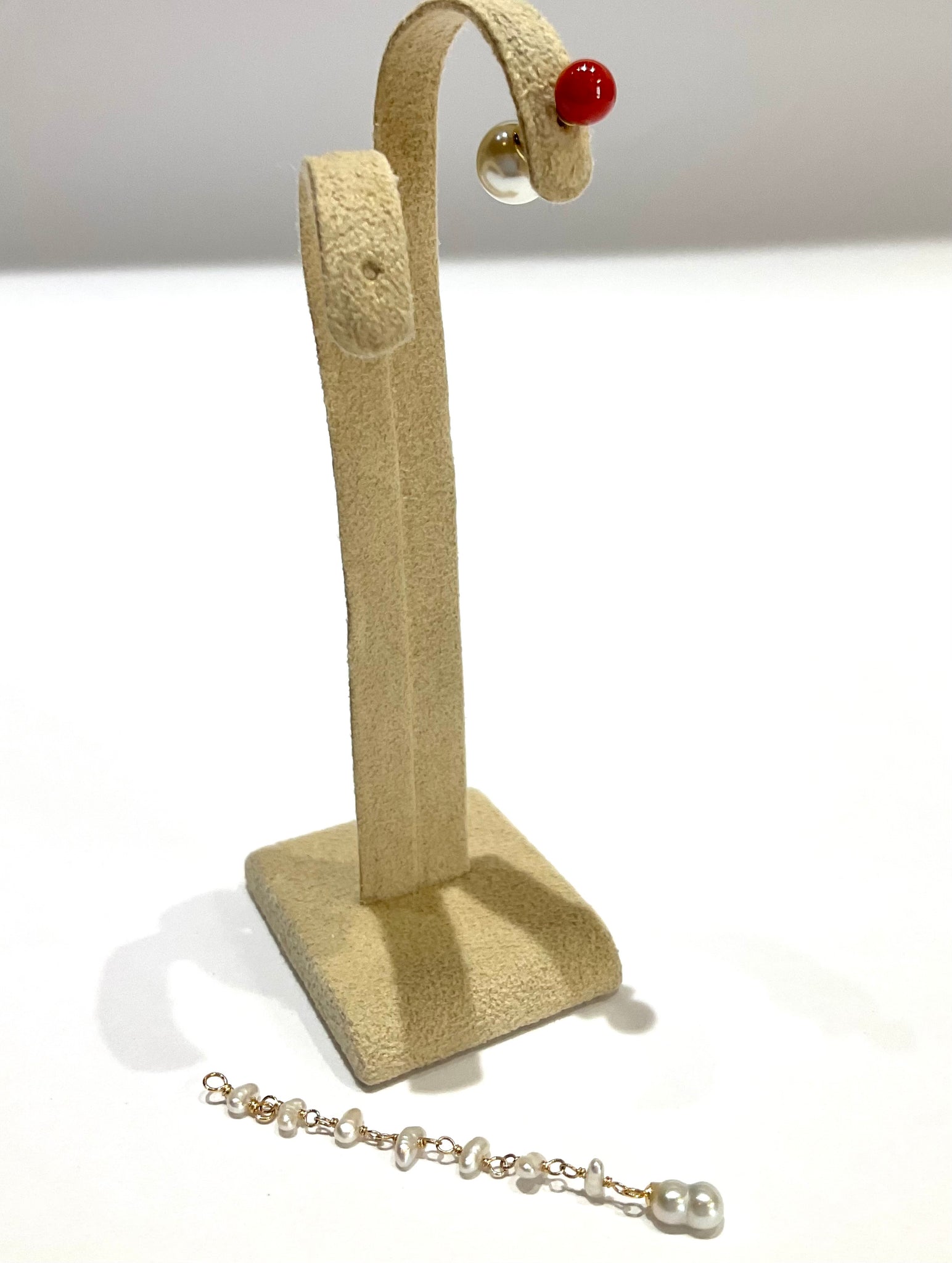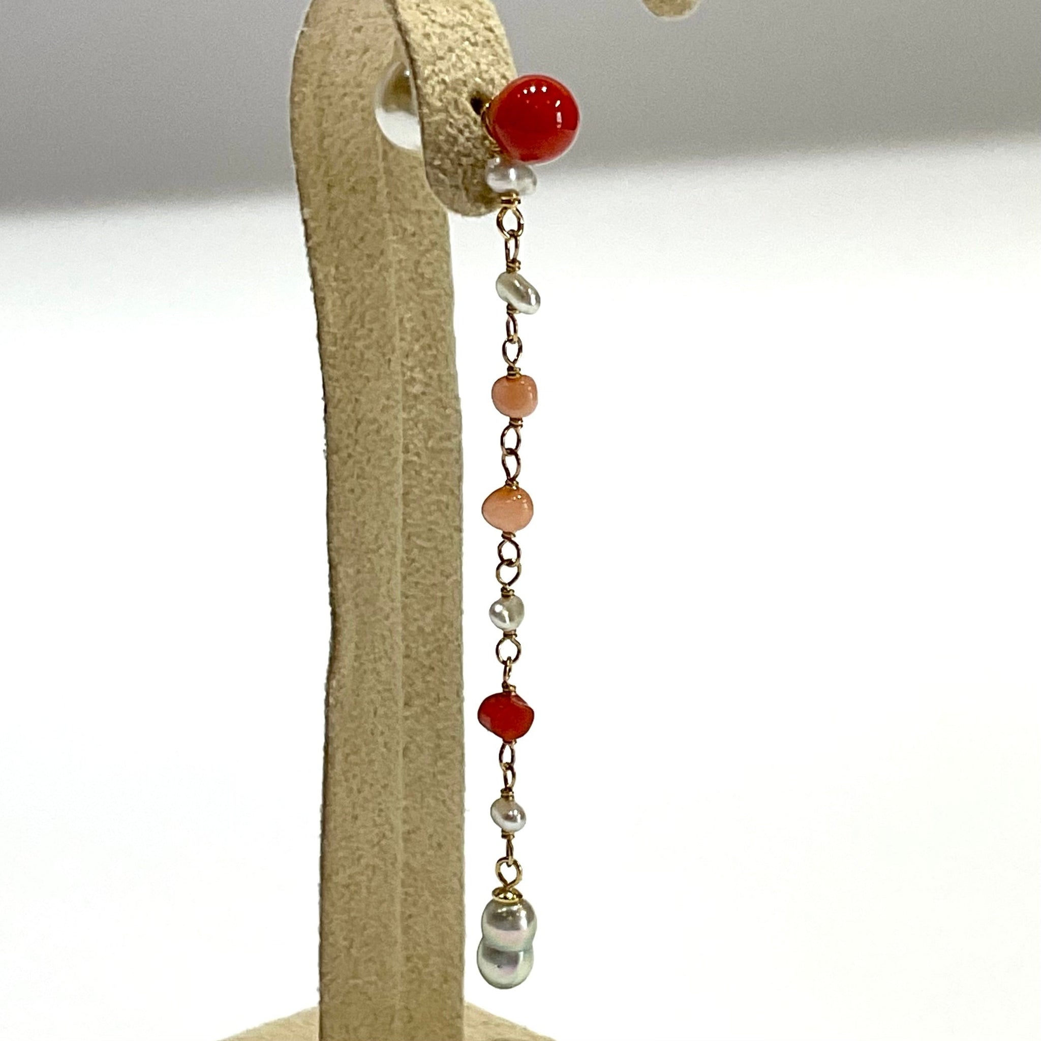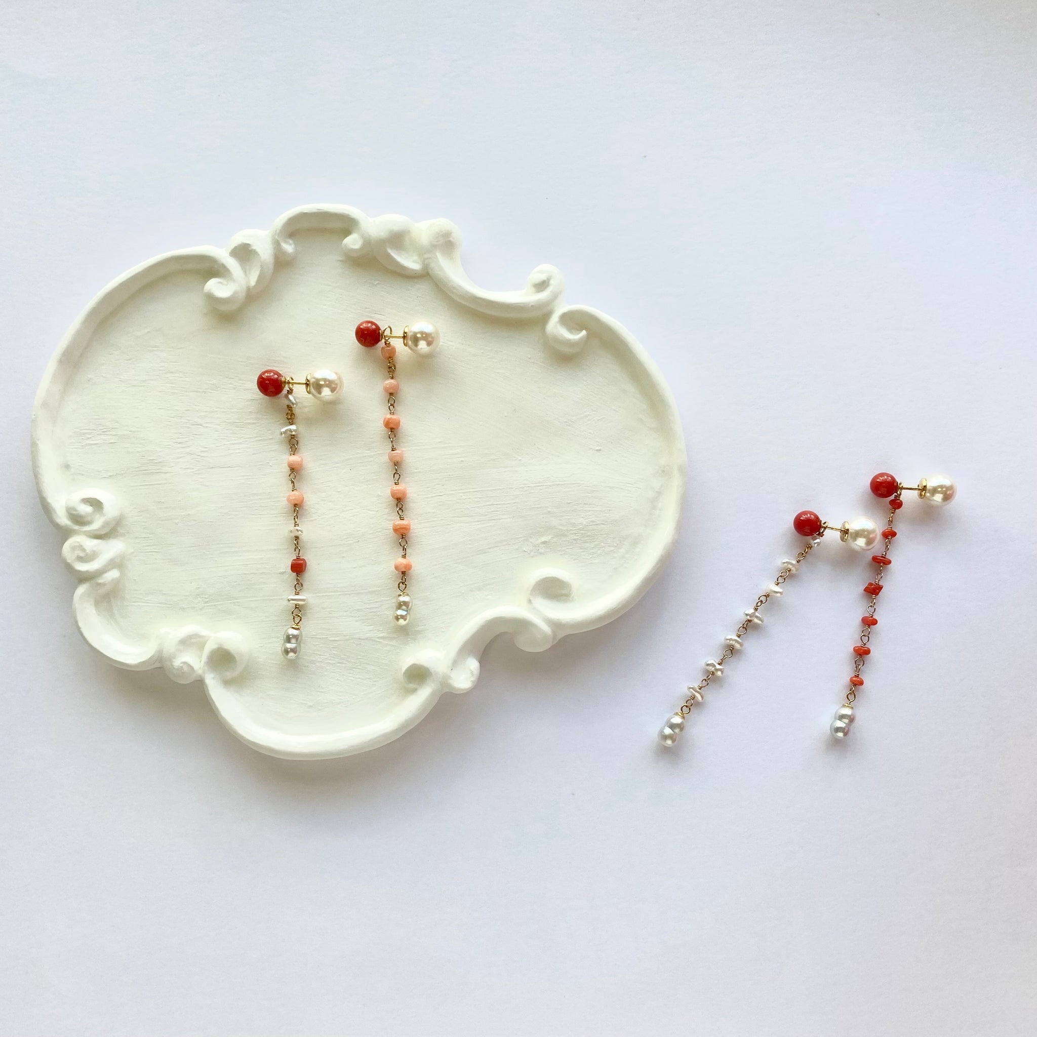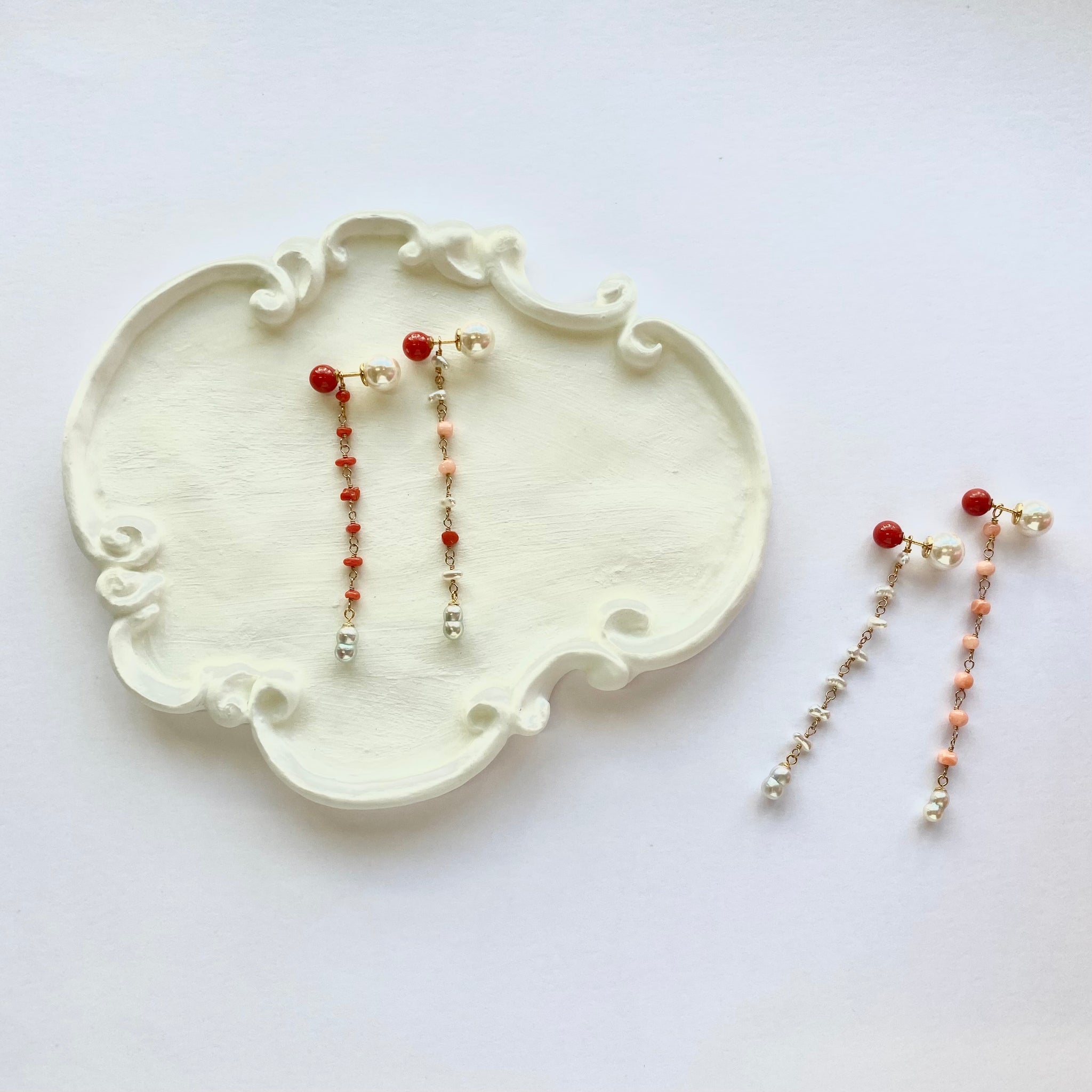 鮮やかな赤が魅力的な丸玉のサルジ珊瑚に、小粒のサルジ珊瑚や深海珊瑚、あこやベビーパールを組み合わせたチャームがかわいいピアス。